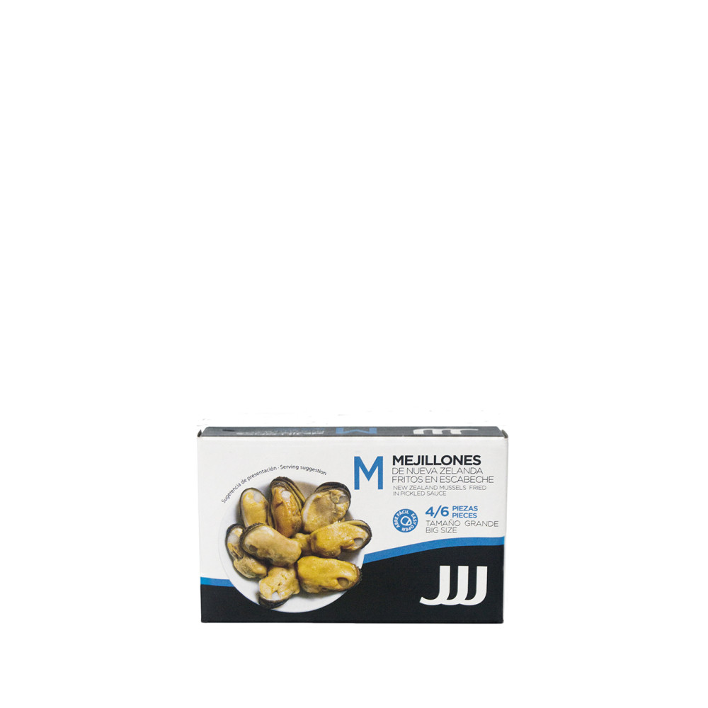 Mejillón (MOLUSCO) de Nueva Zelanda (60%), en escabeche (40%), aceite de girasol, vinagre de vino tinto, agua, aromas naturales y sal.