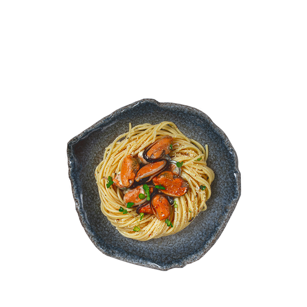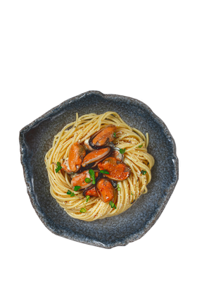Pasta a la siciliana con mejillones en escabeche y dados de calabacín
